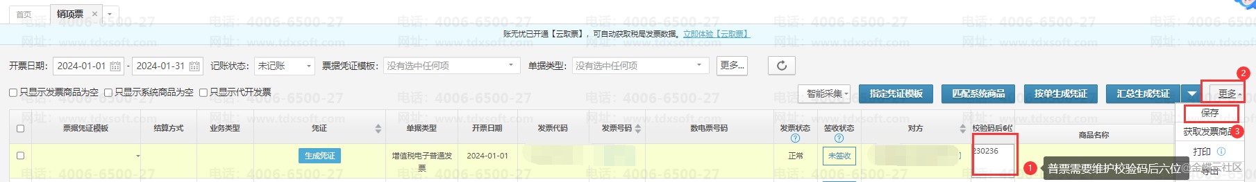 在销项票界面找到没有校验码后6位的普票数据,在校验码后6位这一列中填写好该发票的校验码后6位数据,再点击【更多】下的【保存】按钮,提示保存成功后,再次操作获取商品明细操作即可。