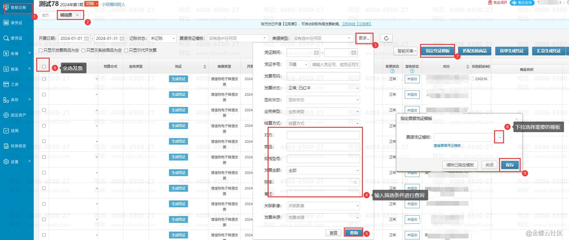 进入账簿,点击【智能记账】→【销项票】,进入销项票界面,可以点击【更多】按钮填写筛选条件再点击【查询】按钮,筛选出需要批量指定票据凭证模板的发票后,再勾选筛选出的全部发票,点击【指定票据模板】按钮,选择票据凭证模板【保存】即可。