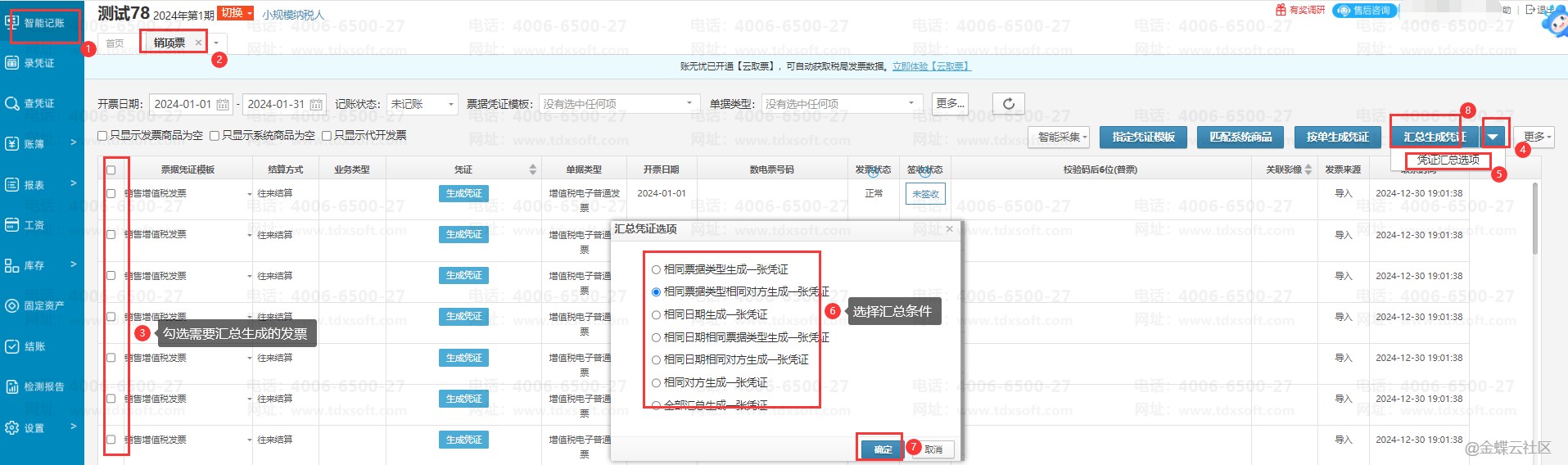 进入账簿点击【智能记账】→【销项票】,进入销项票界面勾选要生成凭证的发票,点击【汇总生成凭证】旁的倒三角点击【凭证汇总选项】,在汇总凭证选项弹窗中选择需要的汇总方式后点击【确定】按钮,再点击【汇总生成凭证】按钮,即可按选择的汇总规则对应汇总生成凭证。