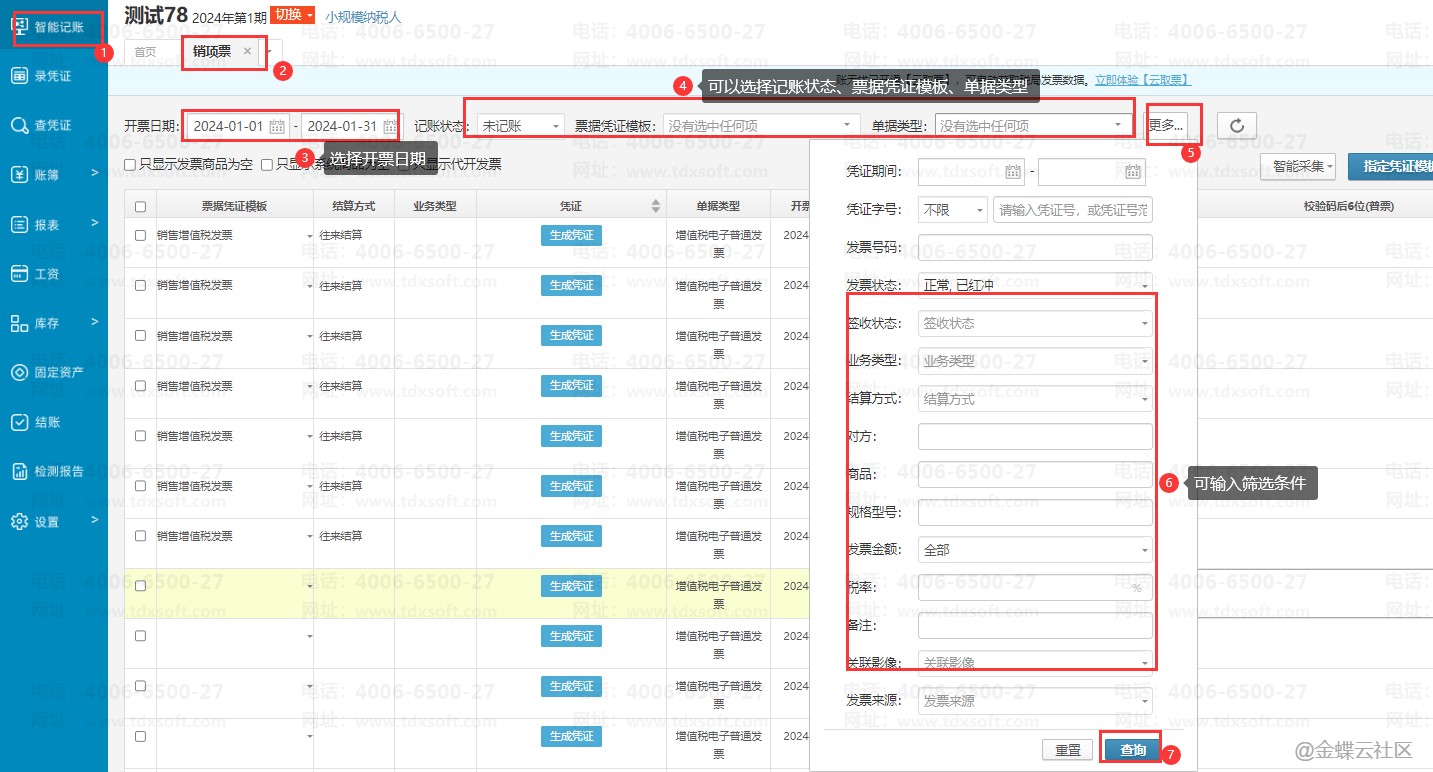 进账簿后,点击【智能取票】→【销项发票】进入销项发票界面,上方的筛选条件可以对发票的开票日期、发票是否已记账、发票的认证状态、票据凭证模板、单据类型进行筛选,点击【更多】按钮,在更多里面也有更多的筛选条件可以进行选择,按需要的筛选条件进行筛选后,点击【刷新】按钮即可筛选出符合条件的发票数据。