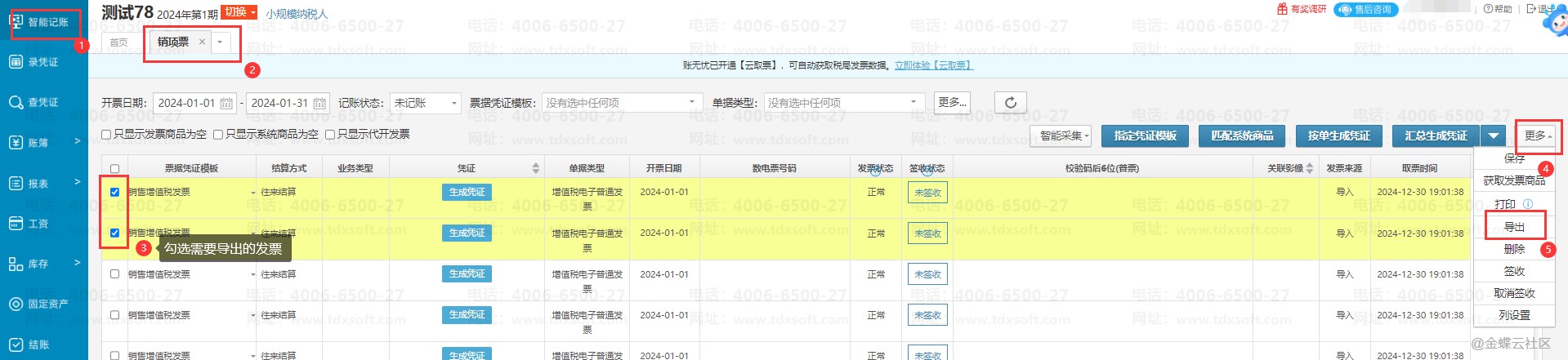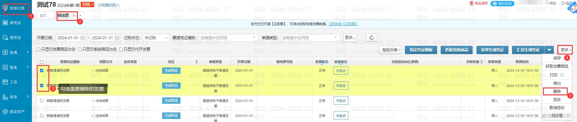 进入账簿点击【智能记账】→【销项票】,进入销项票的界面,→勾选上要删除的发票,点击【更多】→【删除】,提示“删除成功”即成功删除。
