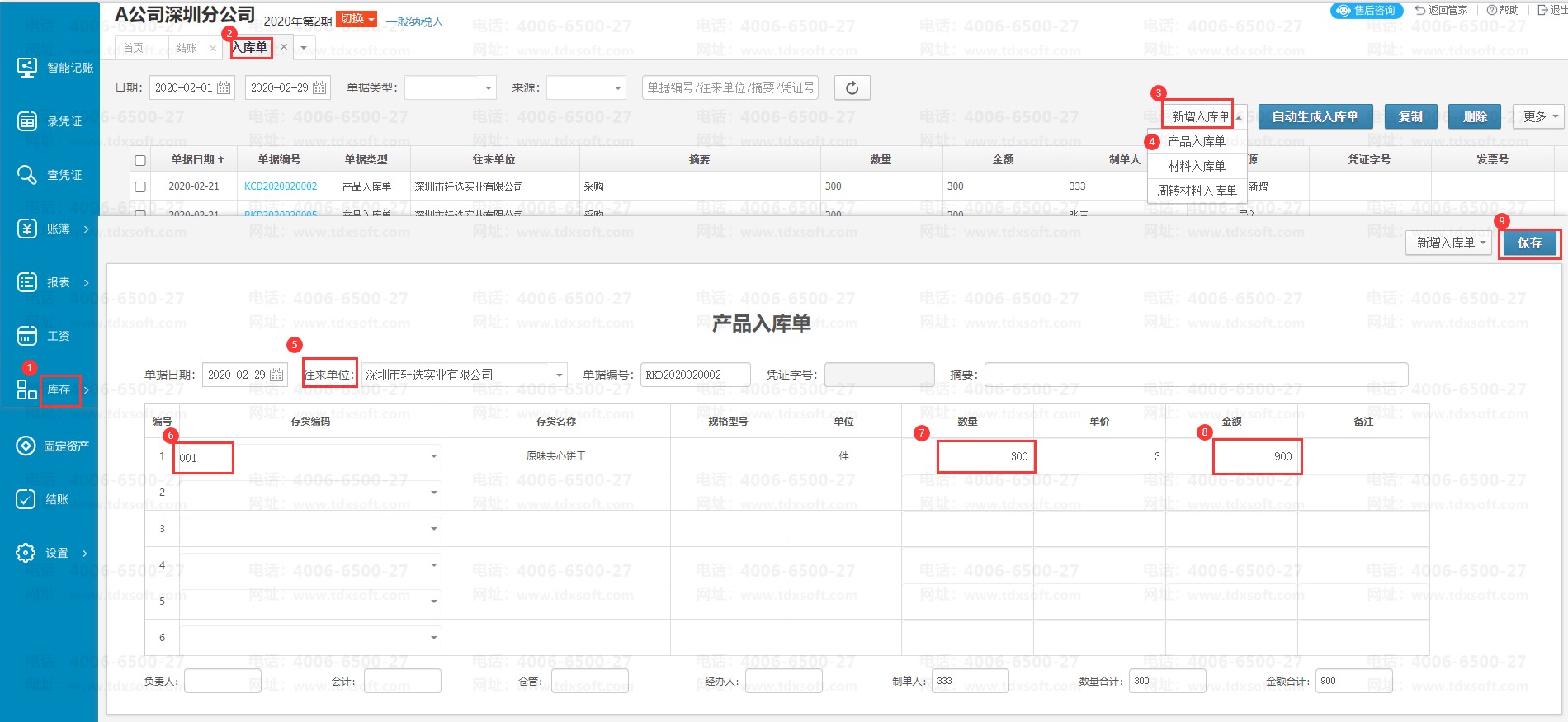 点击【库存】→ 【入库单】点击【新增入库单】选择要新增的入库单,比如产品入库单,填写好内容后,点击保存按钮即可。