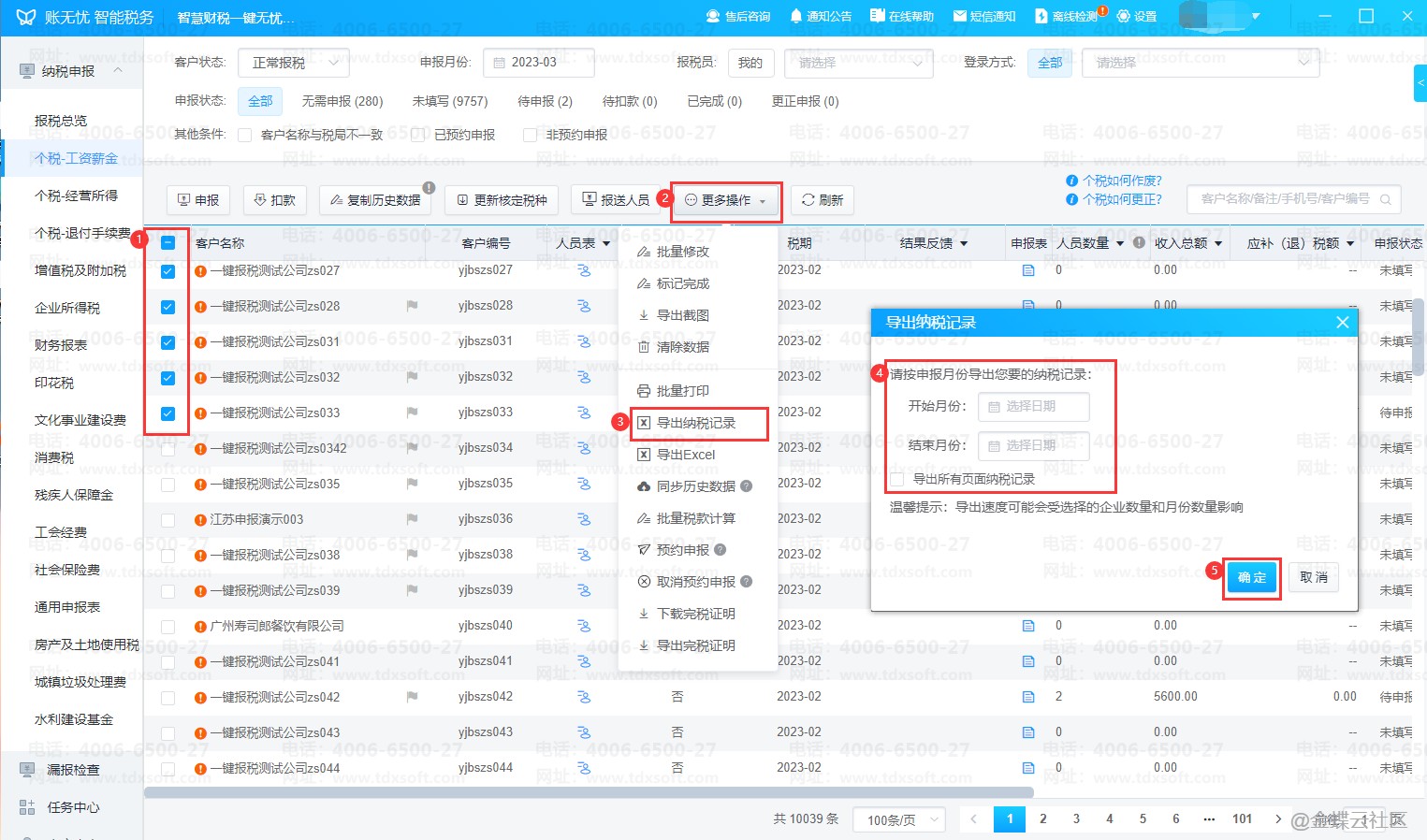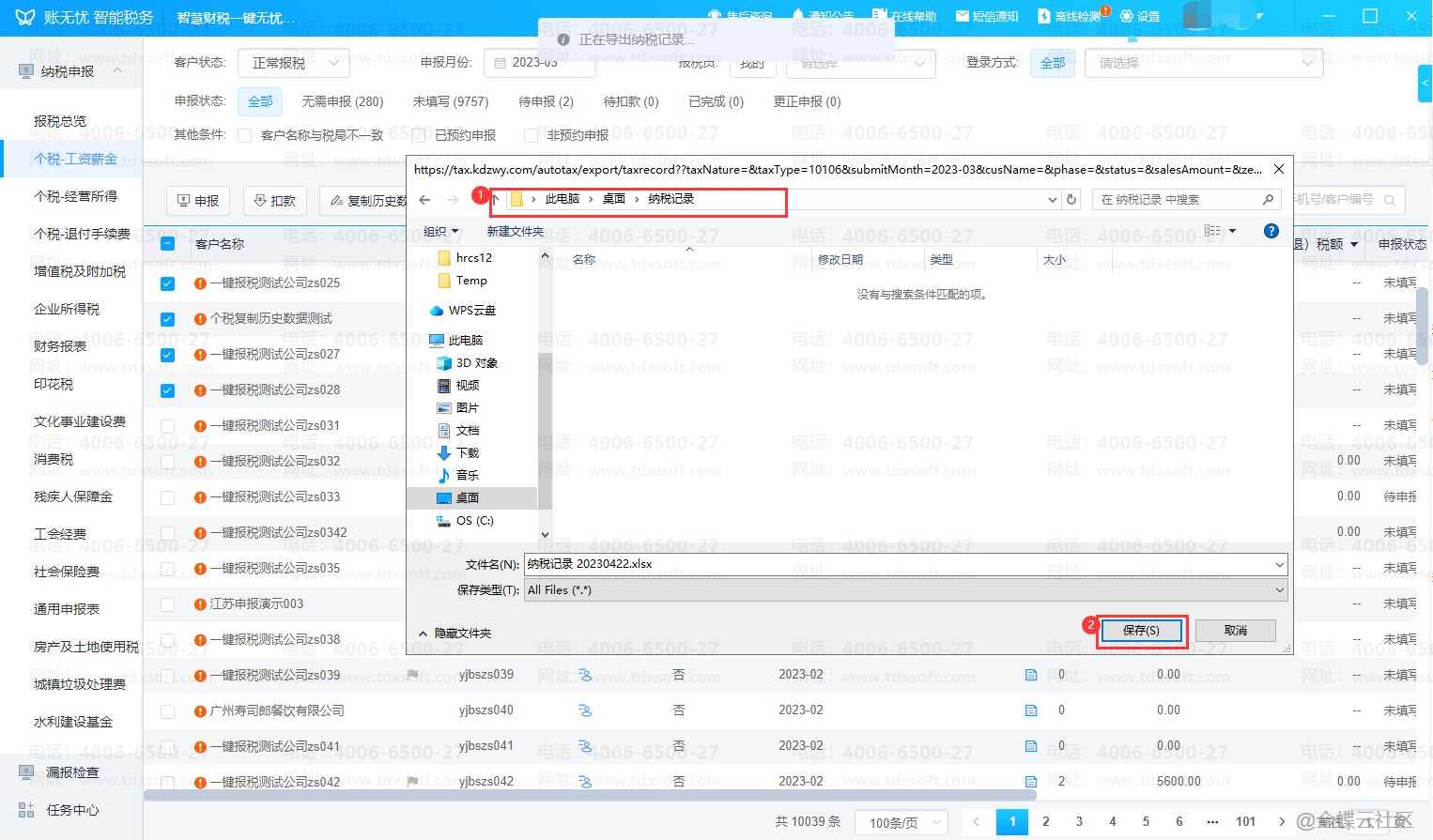 在个税-工资薪金界面,批量勾选上需要导出纳税记录的客户,点击【更多操作】选择【导出纳税记录】。在弹出的窗口中选择要导出的记录日期,然后【确定】,下一步还需要选择要导出文件的存放路径,选择后【保存】即可开始导出。