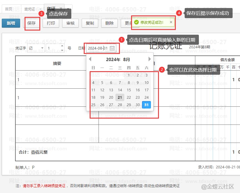 金蝶账无忧如何修改凭证日期