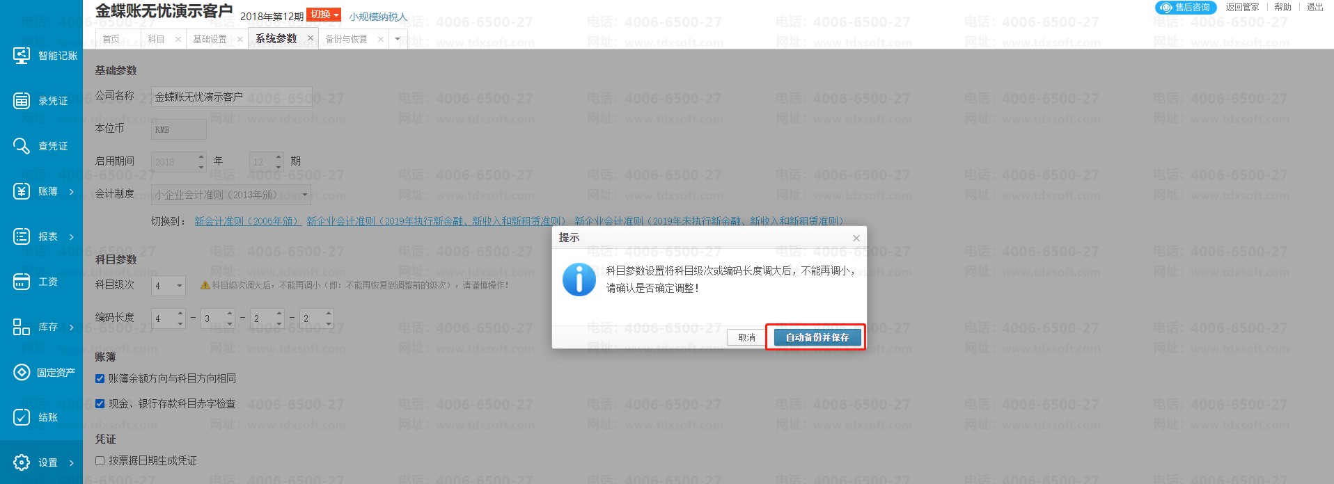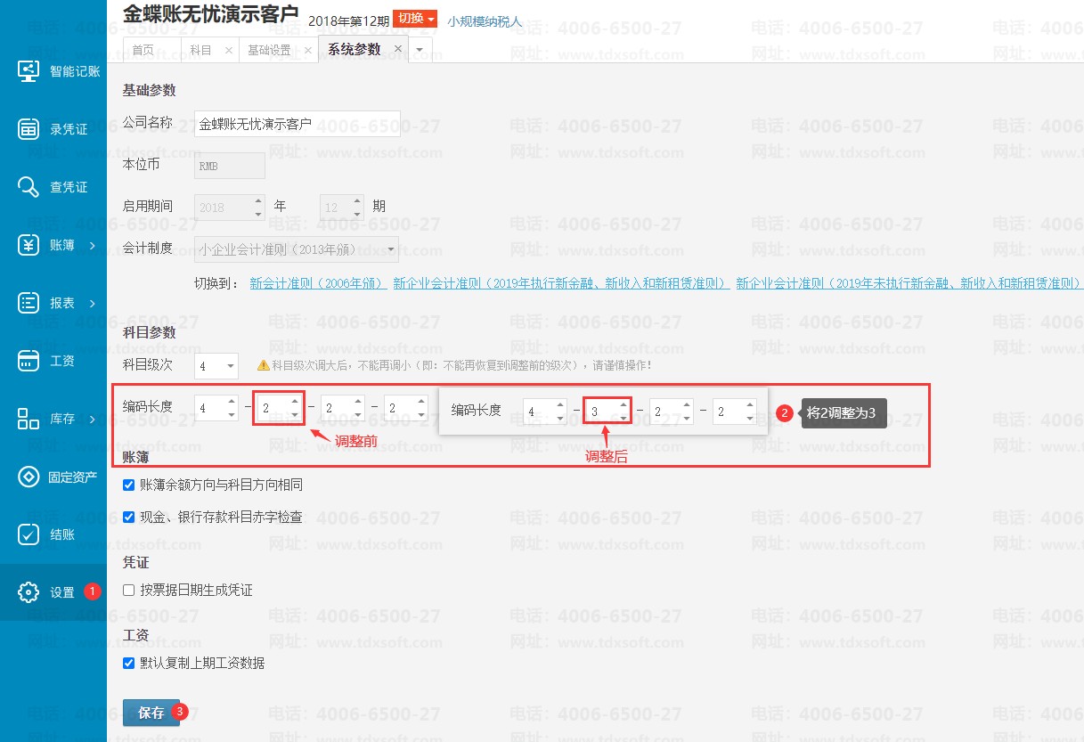 2)将2级科目的编码长度从2改成3,保存(其他参数都不需要调整)