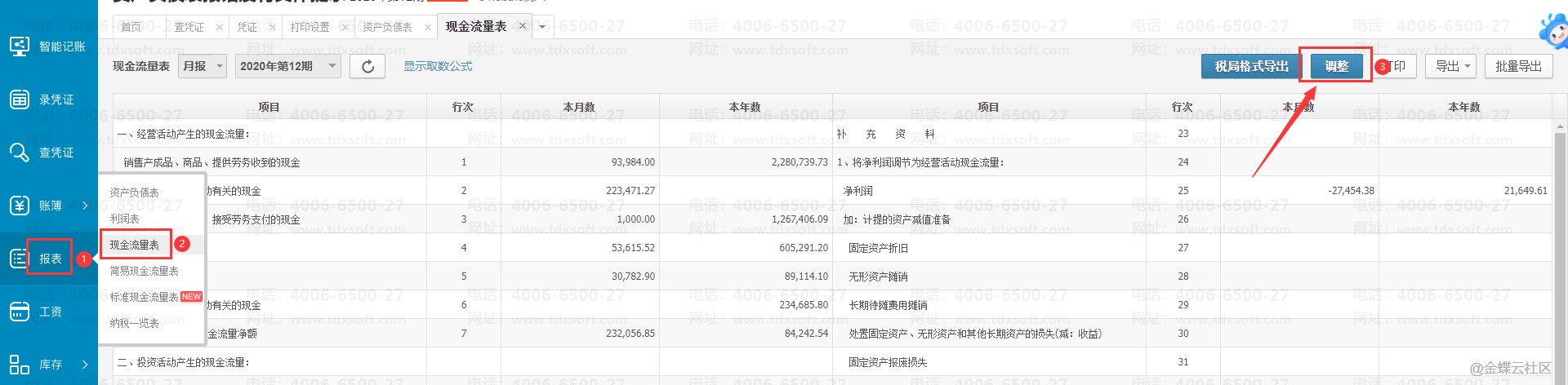 1.进账簿后点击【报表】→【现金流量表】,再点击右上角的【调整】按钮。