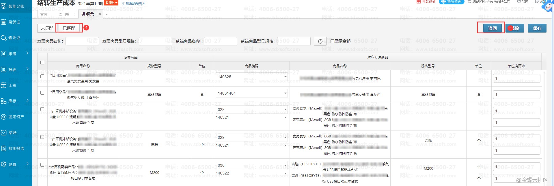 5、再点击【已匹配】,这些发票商品就会进入到已匹配界面,没问题后即可点【返回】按钮,继续下一步的凭证生成操作。