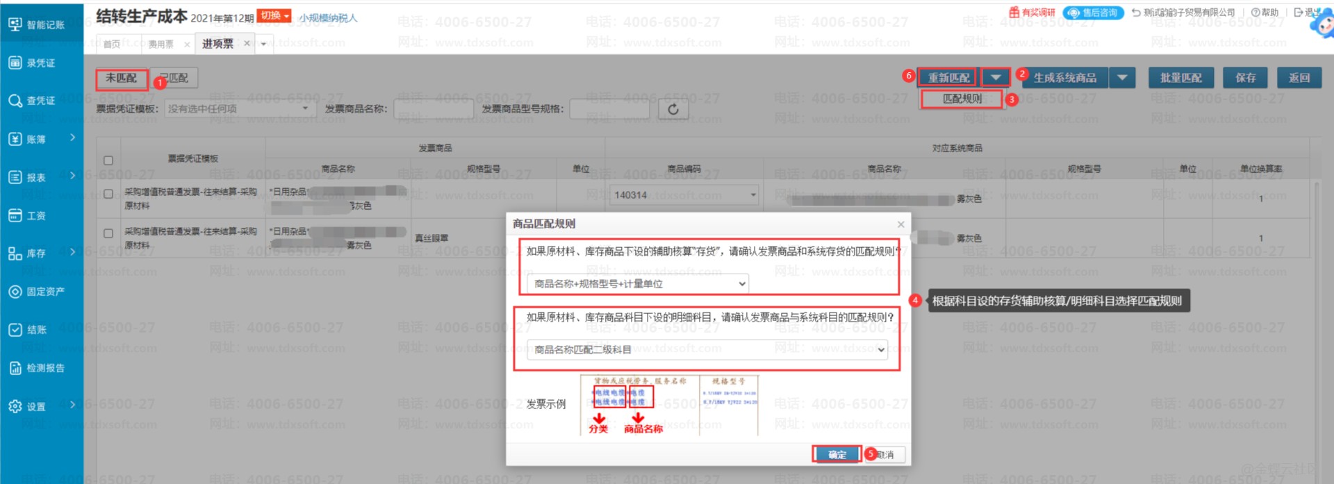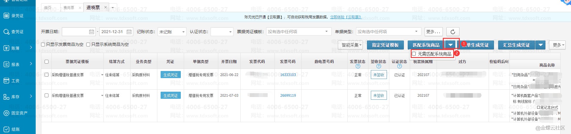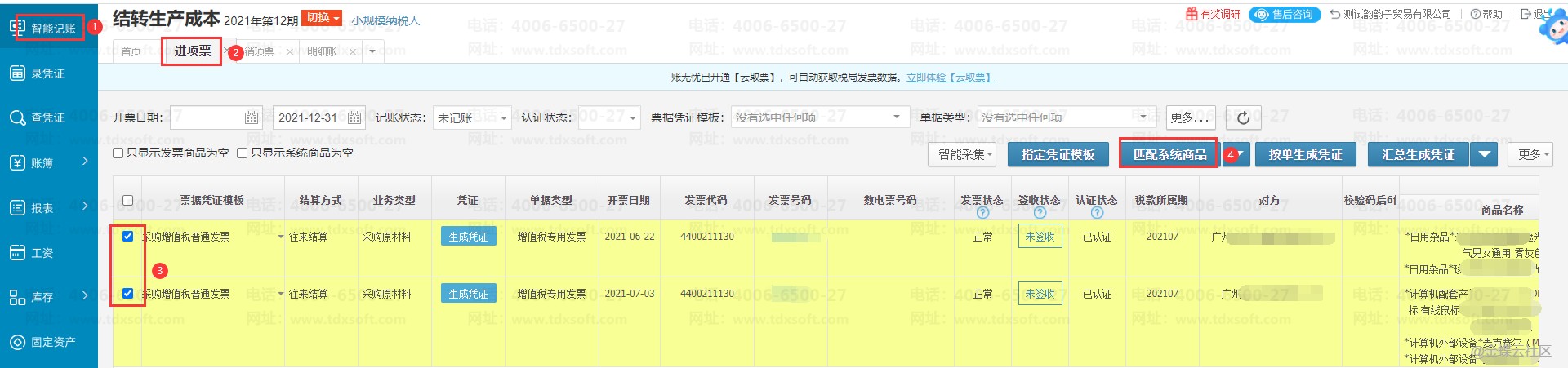 1、进账簿后点击【智能记账】→【进项票】,勾选需要匹配的发票再点击【匹配系统商品】