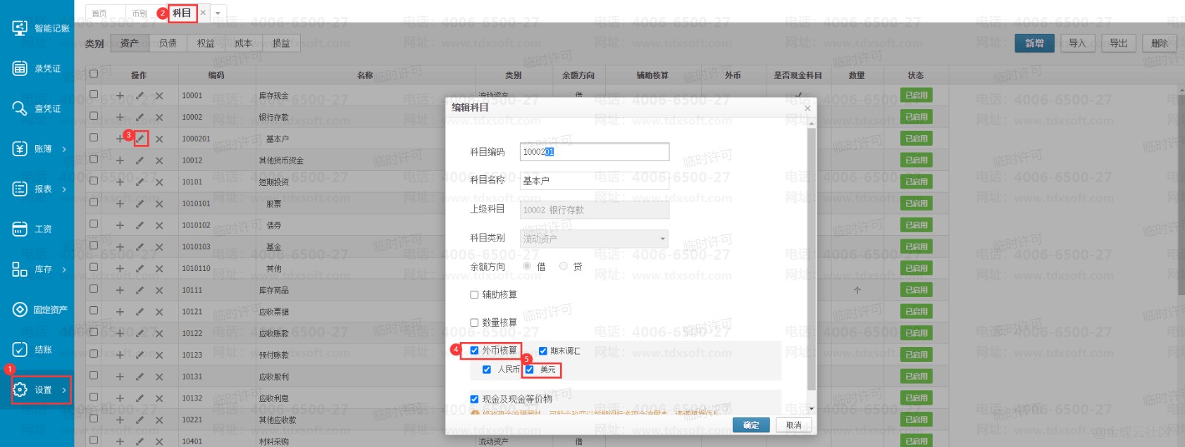 2、点击【设置】→【科目】,需要的科目勾选外币核算