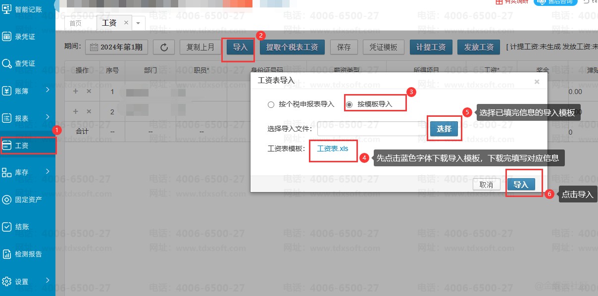 方法二:点击【工资】→【导入】→选择按模板导入,下载好模板编辑好数据后再点击导入。