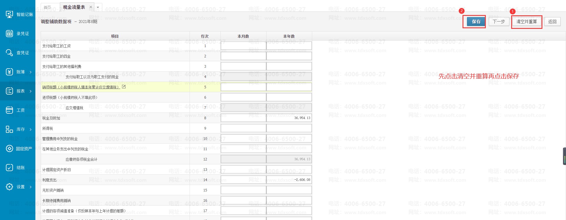 4、加到主表界面后先点击【清空并重算】后再点击【保存】即可