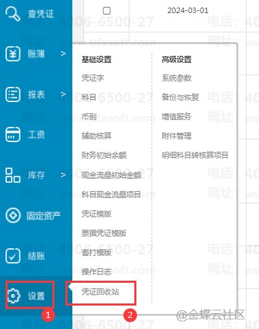 1.打开账套中的【设置】→【凭证回收站】