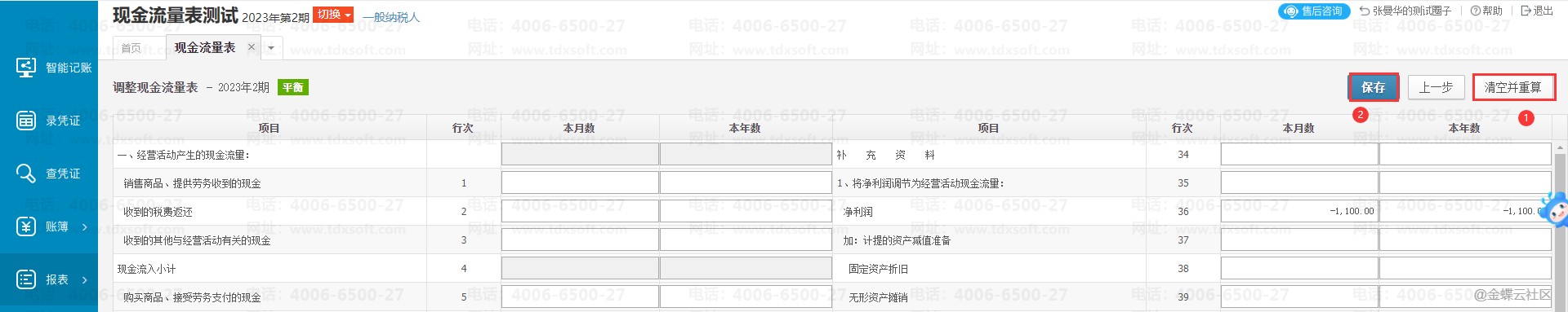 3.进入到现金流量表的调整界面,点击右上角【清空并重算】确认操作后,系统将通过预设的公式重新进行计算,最后【保存】即可,返回报表重新查看数据。