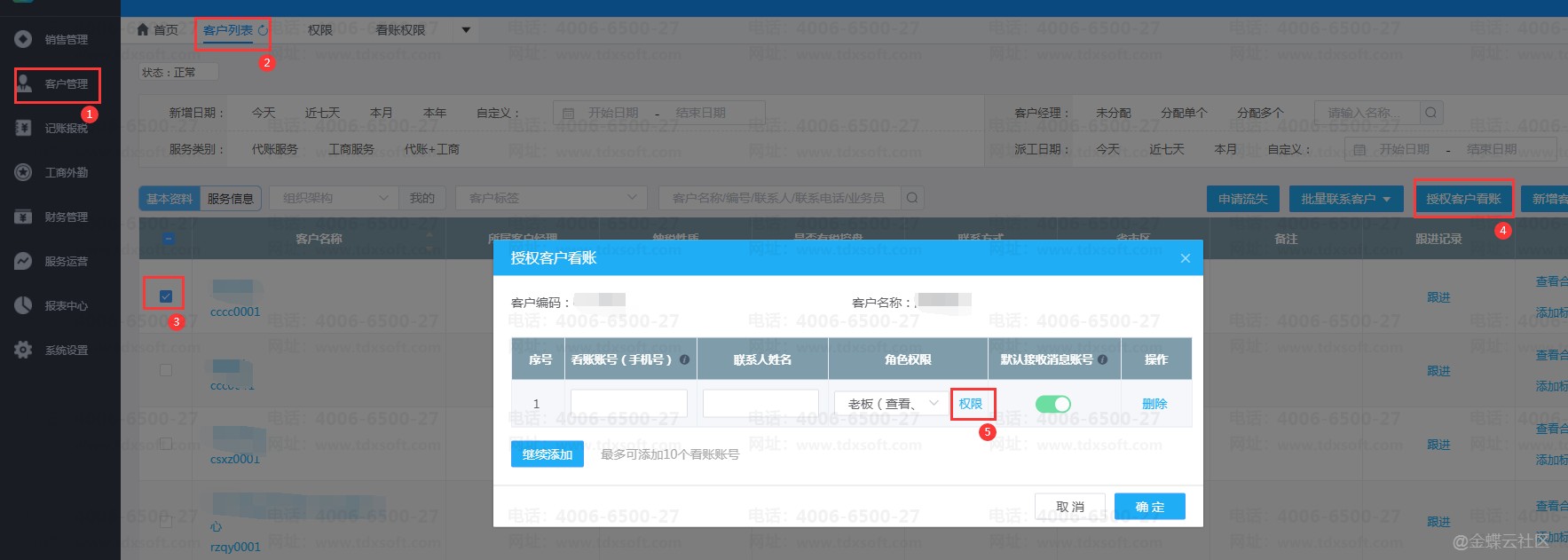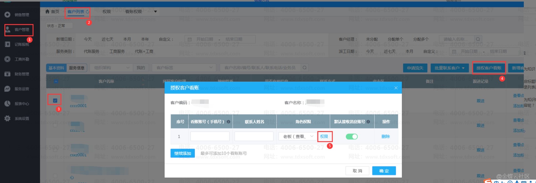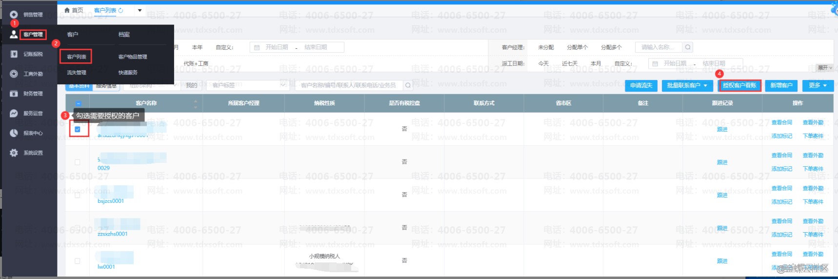 1.【客户管理】→【客户列表】,勾选好需要授权的客户后点击【授权客户看账】,