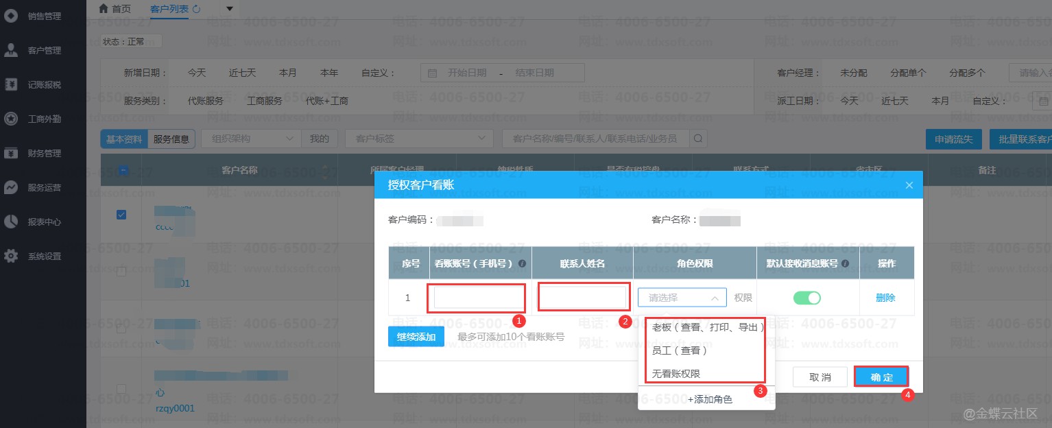2. 填写客户账号(手机号)、(联系人名称),选择角色权限,点击确定