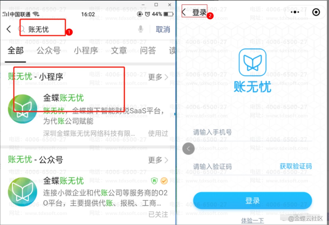 代账客户通过微信搜索“金蝶账无忧”小程序,输入登录账号(即看账账号),接收并录入短信验证码,点击“登录”。