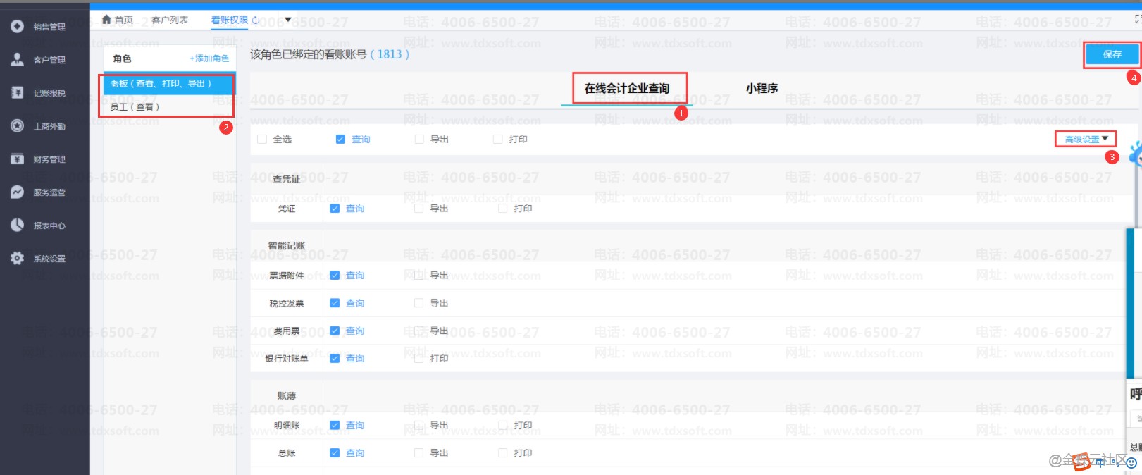 选择【在线会计企业查询】后选择好需要对应修改权限的角色,进行勾选或者取消对应的权限,最后点击保存。