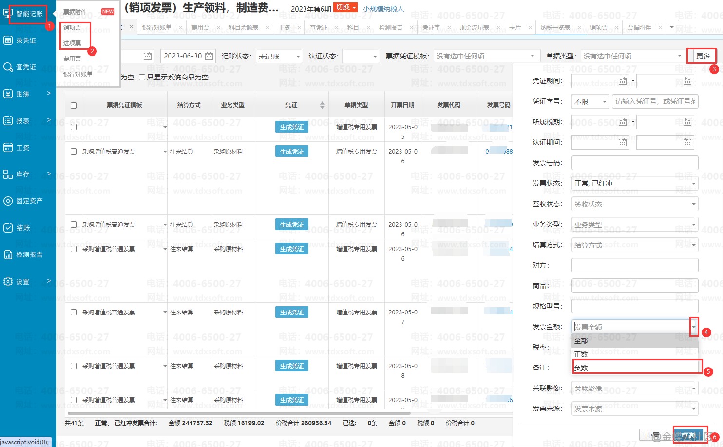 进入账簿后,点击【智能记账】→【进项票/销项票】界面,点击【更多】,发票金额选择【负数】,点击【查询】即可。