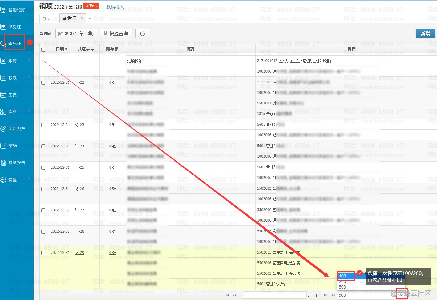 点击【查凭证】,点击下面可查看条数,筛选200或者100,再勾选凭证打印。