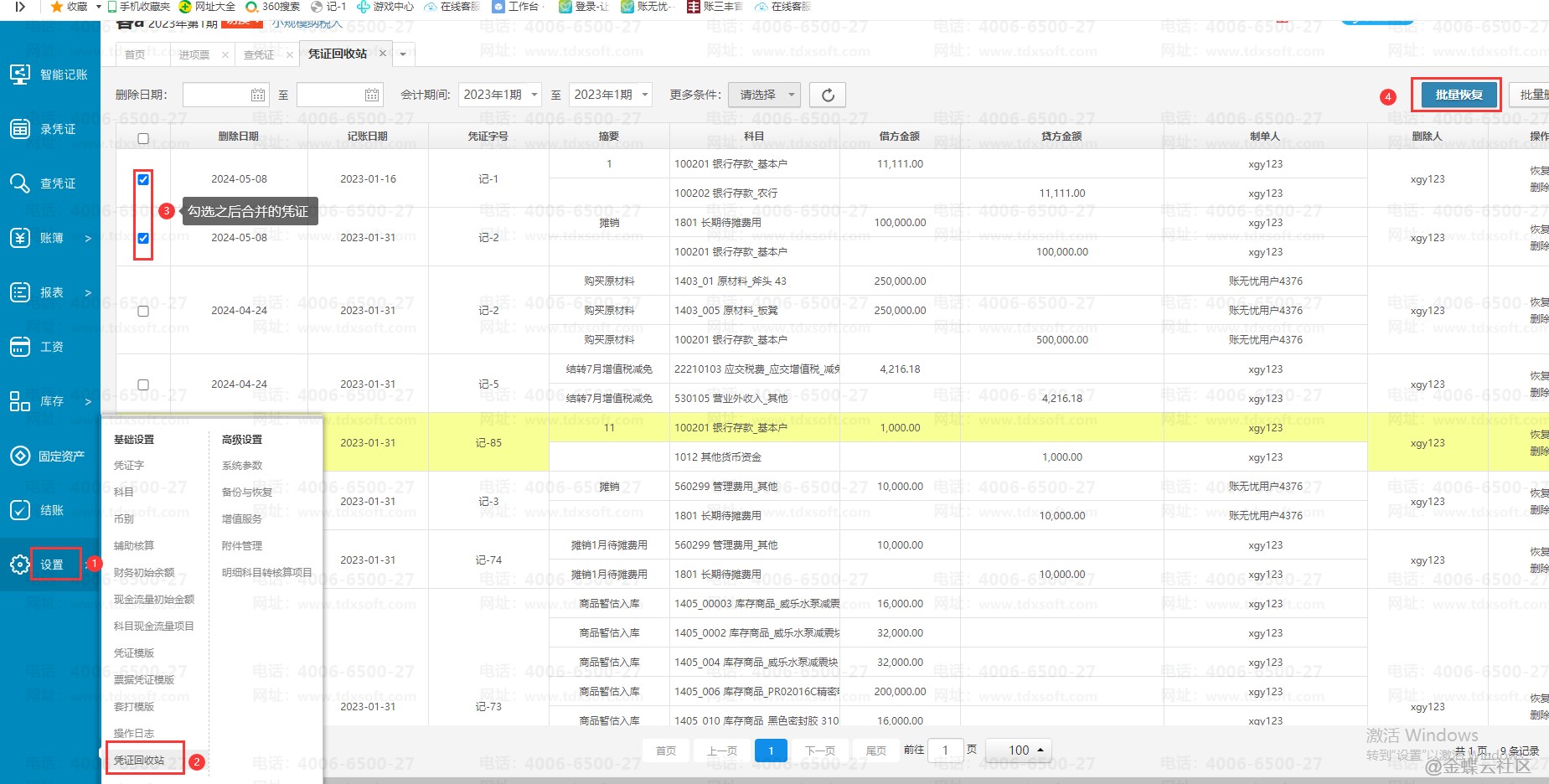 1.在账套里面点击【设置】→【凭证回收站】找到合并前的凭证进行勾选,然后点击【批量恢复】按钮