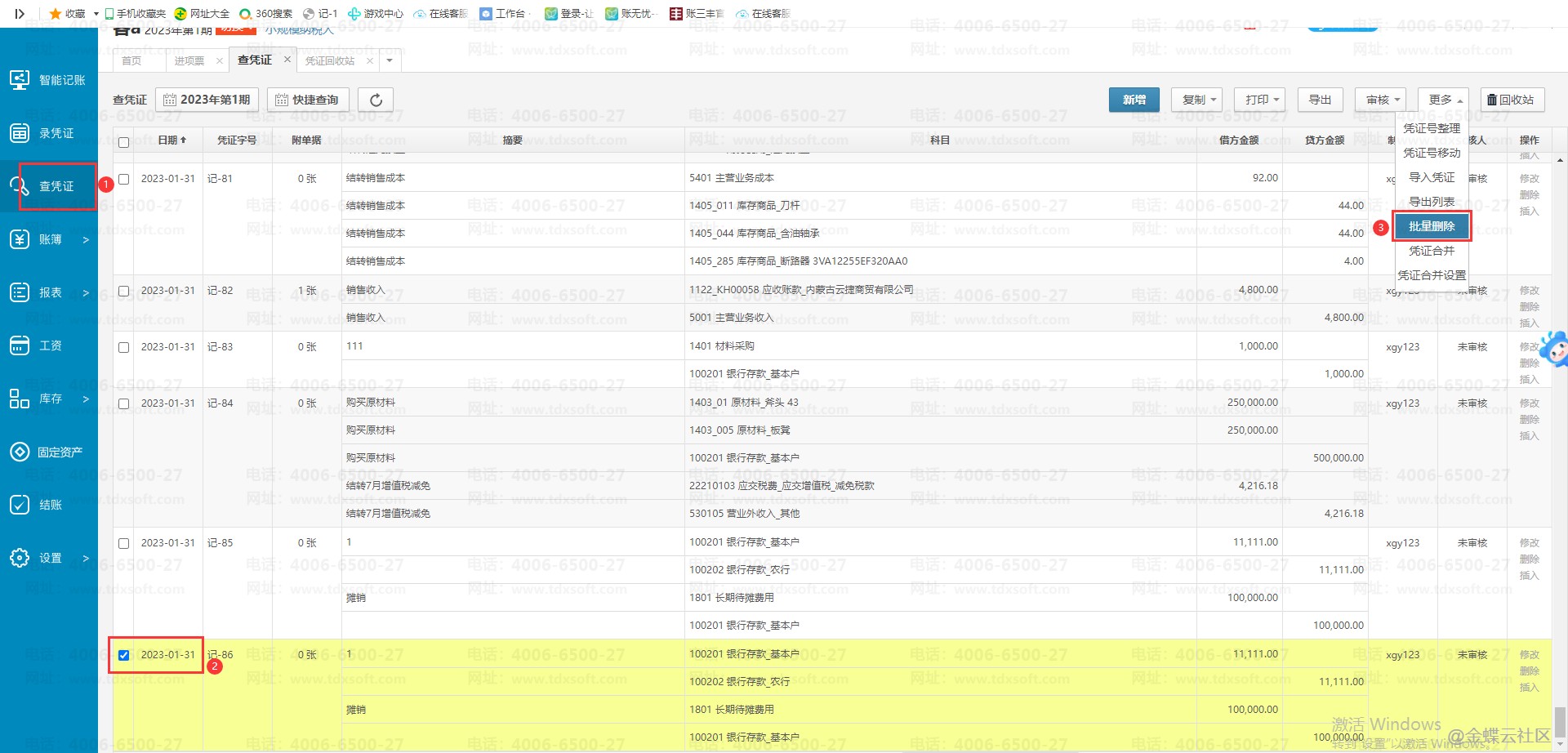 2.在查凭证界面找到合并后的凭证进行勾选,再点击【批量删除】即可