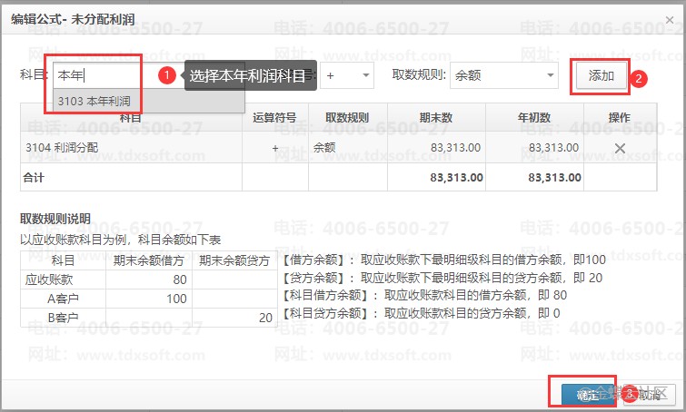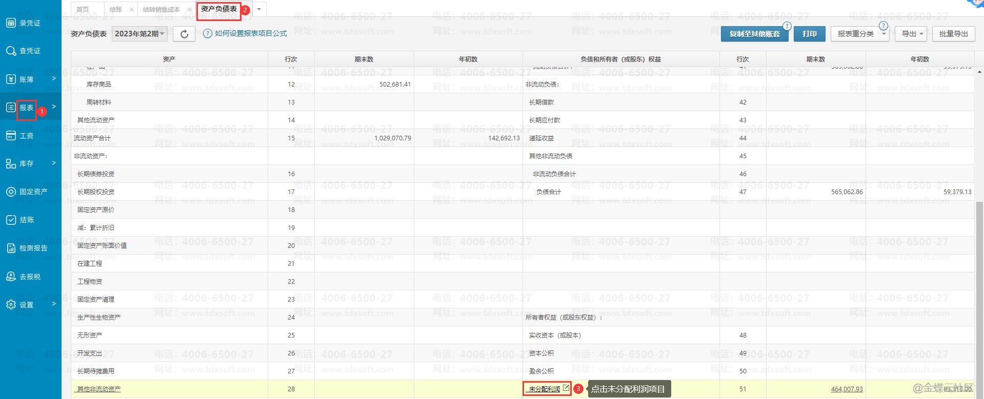 点击【报表】→【资产负债表】,点击资产负债表界面的项目名称【未分配利润】项目,选择本年利润科目,点击【添加】,最后点击【确定】。