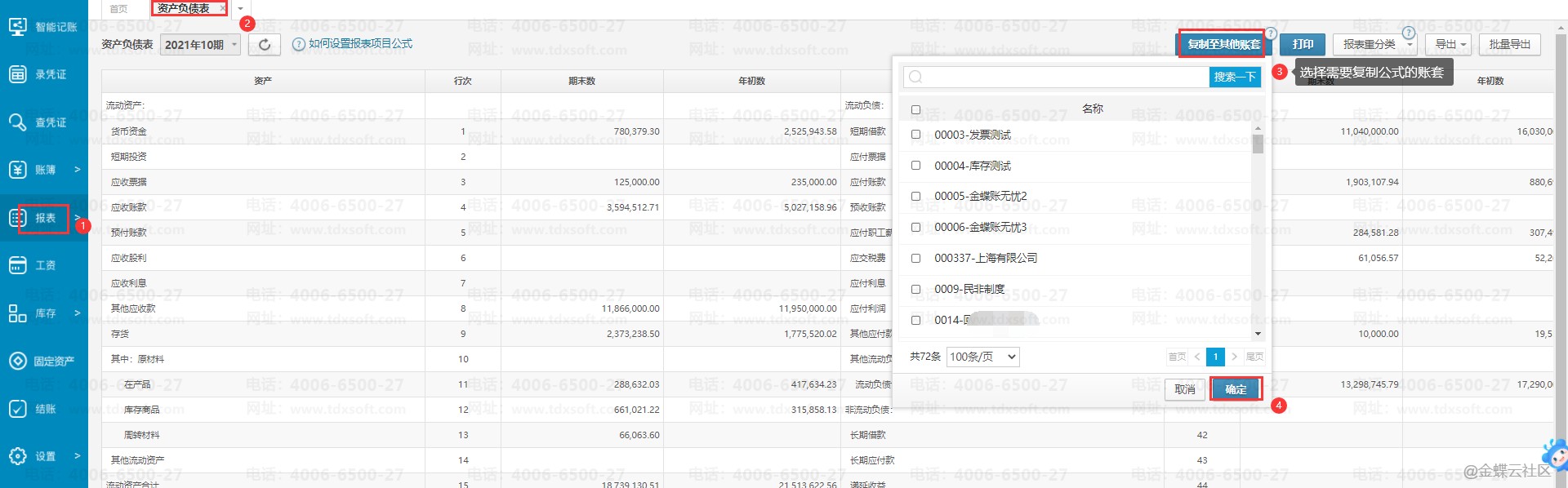 先进入报表公式正常的A账套内,点击【账簿】→【资产负债表】/【利润表】/【简易现金流量表】点击右上角【复制至其他账套】按钮,勾选报表公式异常的B账套,点击【确认】按钮,即可将当前的报表公式复制到其他的账套中。