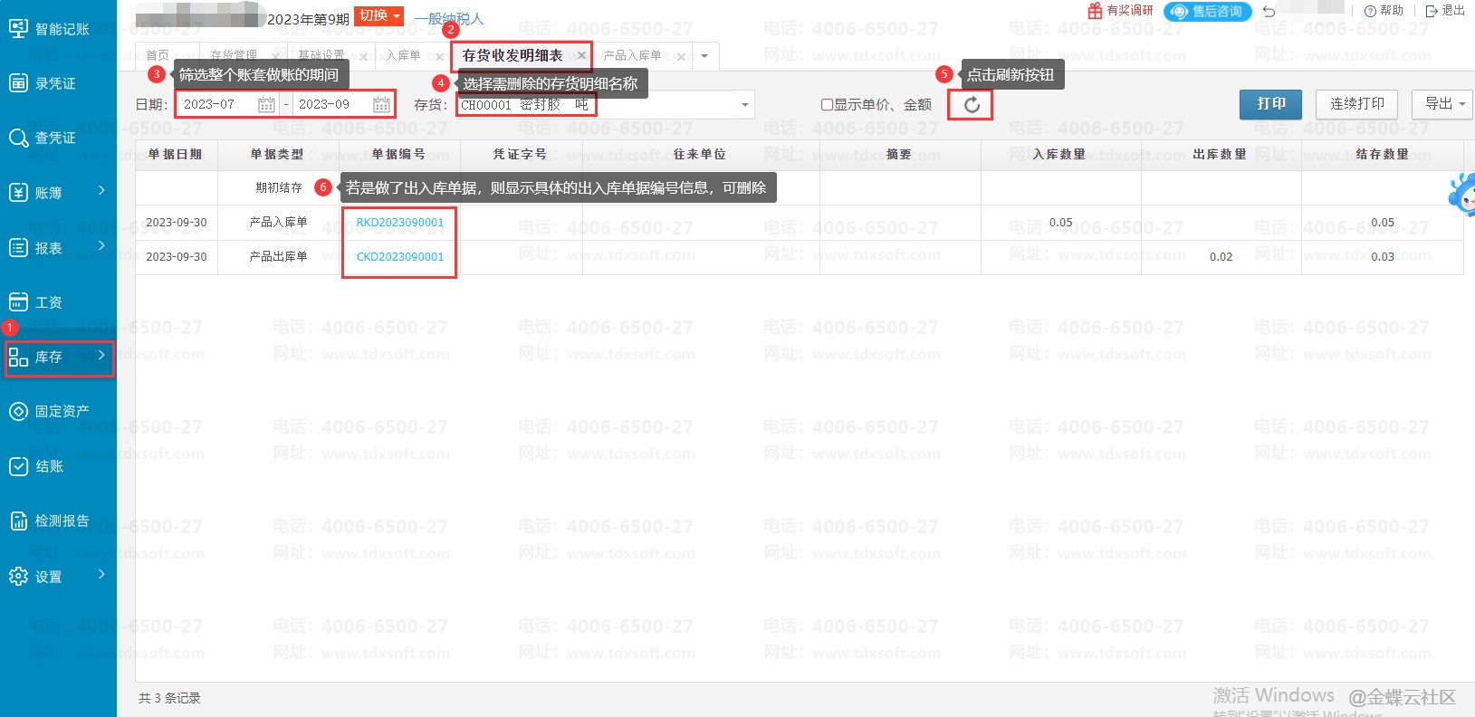 点击【库存】→【存货收发明细表】,进入页面【日期】筛选账套做账的所有账期时间(即筛选从账套建账日期到现在最新的做账期间),【存货】选择需删除的存货明细名称并点击刷新按钮即可筛选出数据,筛选出的出入库单据需要删除这个存货的数据,才能删除掉这个存货。