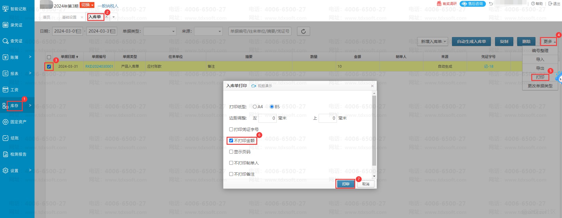 V6.0账无忧入库单/出库单打印如何不打印金额