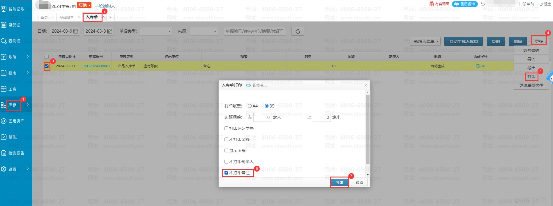 进入账簿,在【库存】→【入库单/出库存】页面勾上要打印的入库单,然后点【更多】→【打印】,选择对应的打印纸型,然后勾选上【不打印备注】后点击打印即可。