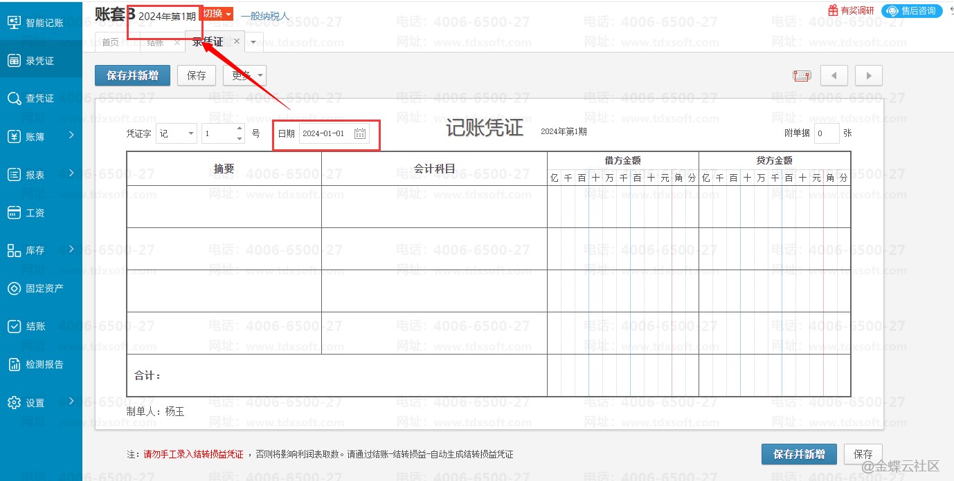 2.结转下一期成功后,录凭证界面的日期对应2024年1月。