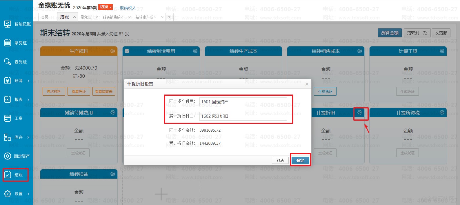 在【计提折旧模块】点击齿轮设置,检查计提折旧设置的相关结转科目是否设置完整,参考如下,设置好后点击【保存】,重新测算金额即可