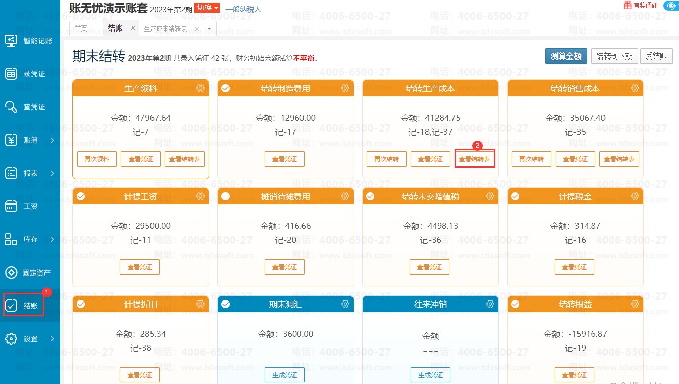 进账簿点击【结账】,在结转生产成本模块上点击【查看结转表】,在生产成本结转表界面点击左上角的“结转清单1”“结转清单2”切换查看即可