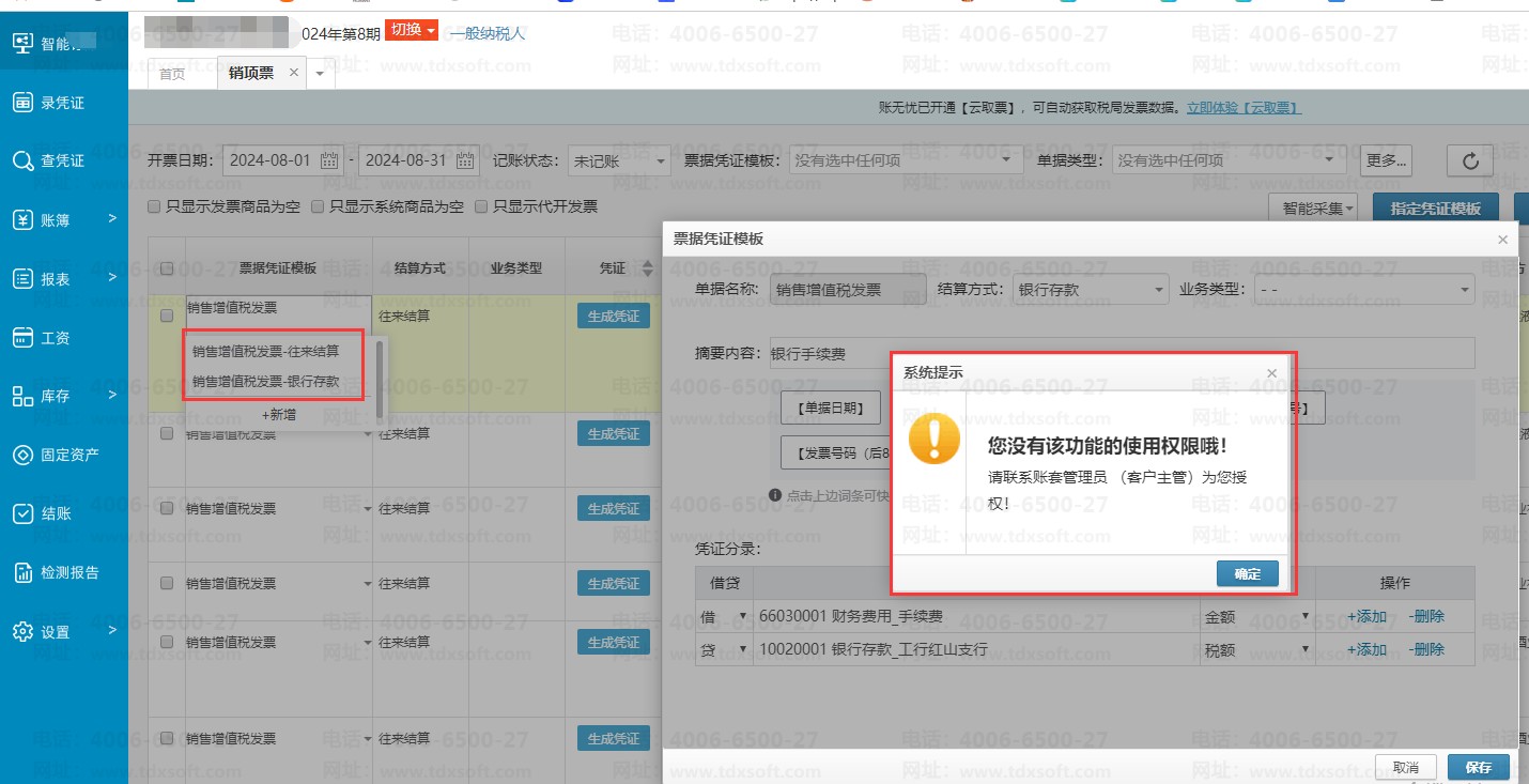 在发票界面修改票据凭证模板,保存时提示没有权限怎么处理?