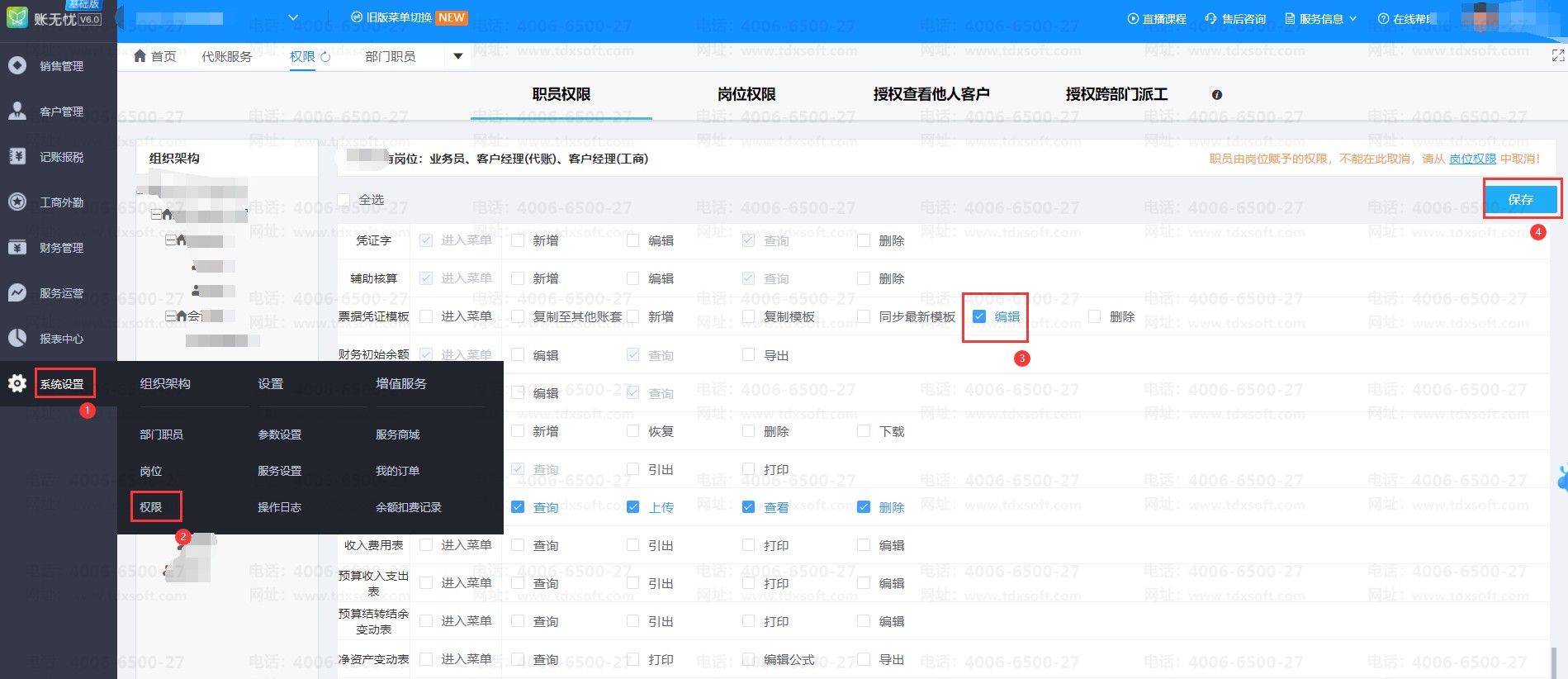登录超级管理员账号,将对应的职员设置权限。点击【系统参数】→【权限】,在左边组织架构处,选中这个职员名称,在职员权限下找到【票据凭证模板】→勾选【编辑】,最后点击【保存】即可。