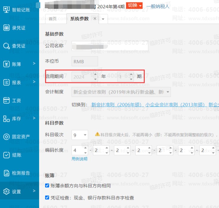 进账套后打开【设置】→【系统参数】界面,即可查看账套启用期