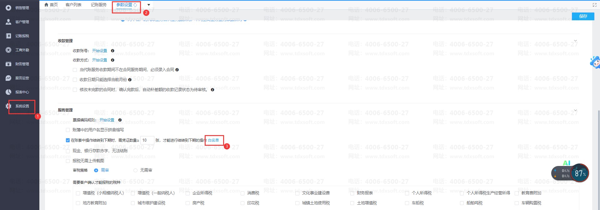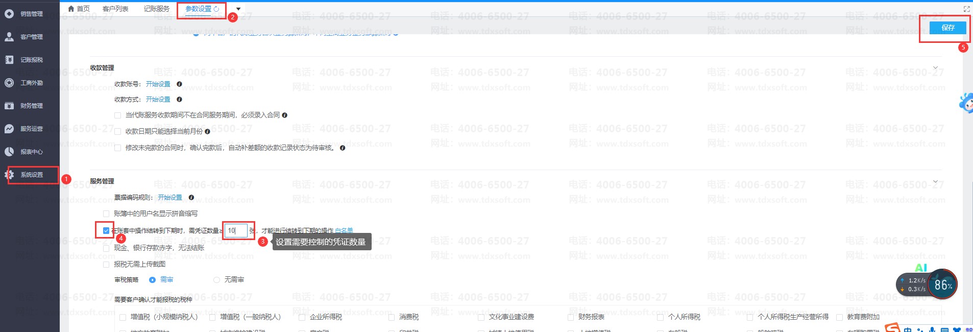 在登录账无忧打开【系统设置】→【参数设置】,在【服务管理】这里找到【在账套中操作结转到下期时,需凭证数量≥ 张,才能进行结转到下期的操作 】,设置凭证数量并进行勾选,点击【保存】按钮,再重新刷新账套即可。