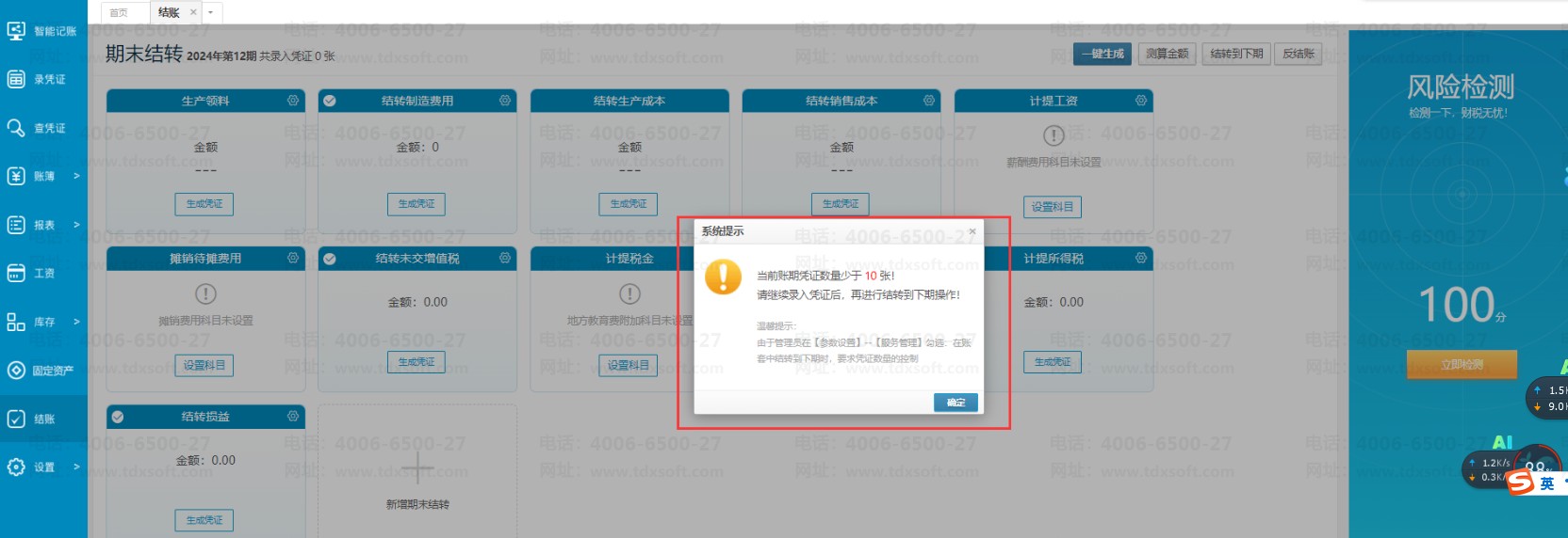 如结转下期时凭证数量低于设置的凭证数量时,系统会提示“当账期凭证数量少于X张!请继续录入凭证后,再执行结转到下期操作!”,若需要继续结转,需要到代账管家界面【参数设置】→【服务管理】那里取消勾选后再结转。
