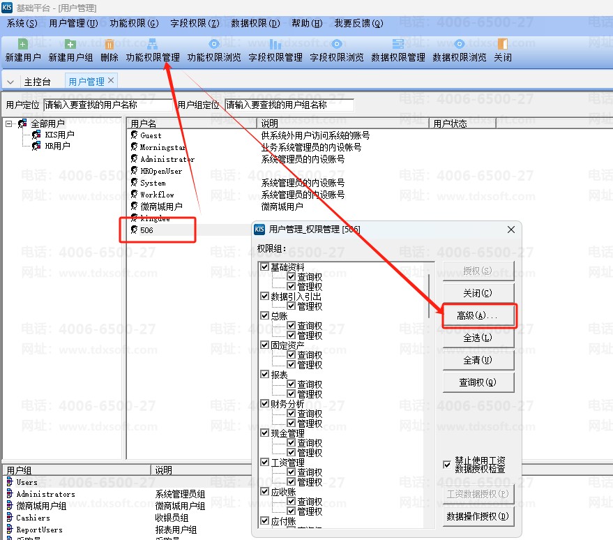 2、选择对应用户,选择【功能权限管理】-【高级】,找到【供应链物流单据(不包含库存单据)】下的采购订单,授予对应权限即可。