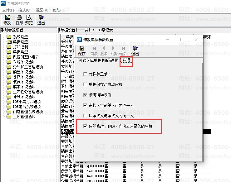3、在选项页签中,取消勾选“只能修改、删除、作废本人录入的单据”即可。