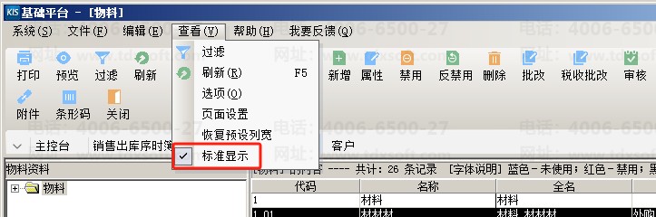 2、打开【基础平台-物料】窗口,单击菜单【查看】选中子菜单【标准显示】即可。