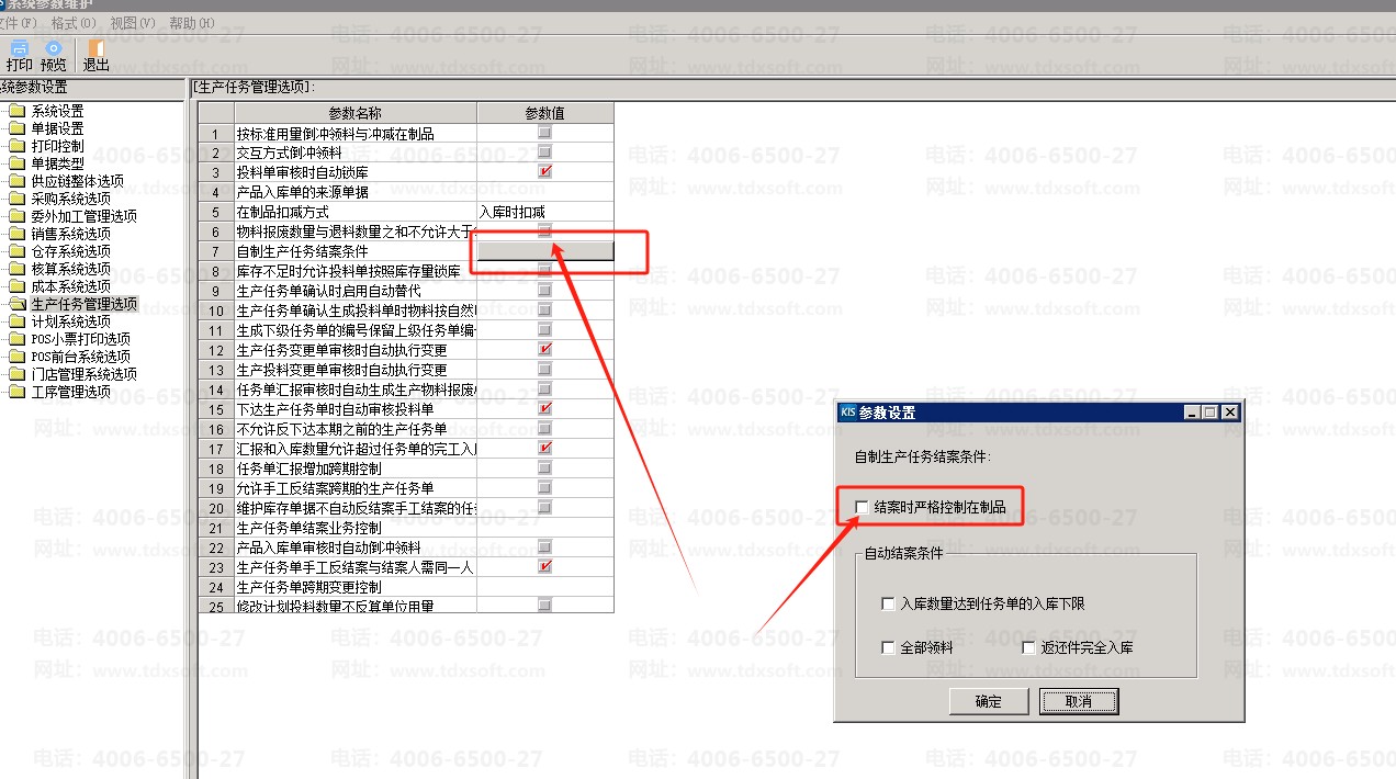 设置生产任务单结案时严格控制在制品,需操作进入[系统设置]-[生产管理]-[系统设置]-[自制生产任务结案条件]-勾选参数[结案时严格控制在制品]。详情如下图所示: