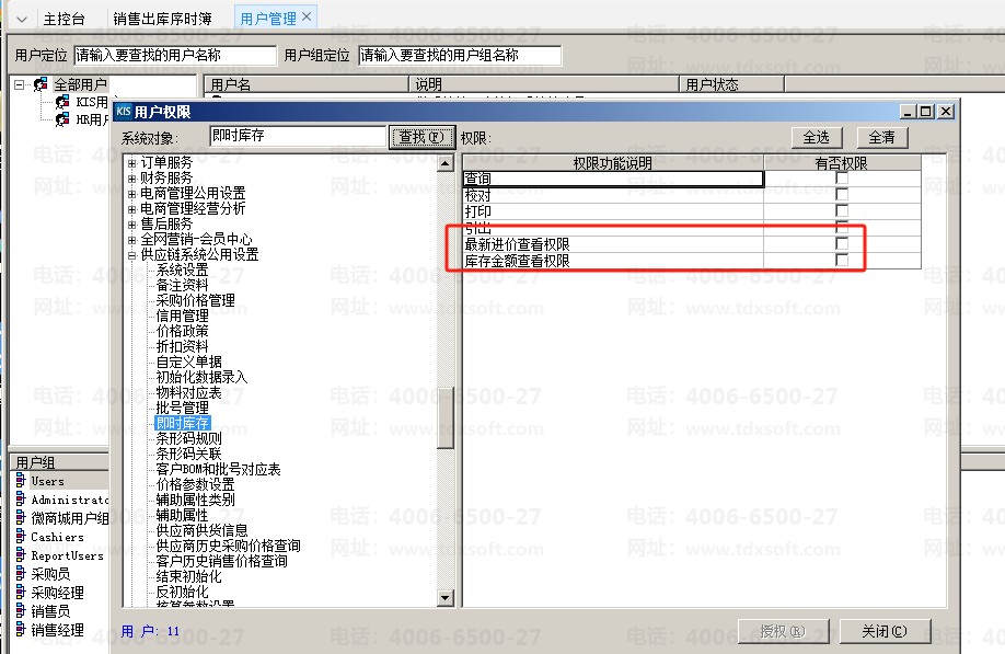 依次点击【系统设置】→【用户管理】→【用户管理】双击【用户管理】,进入【基础平台-用户管理】界面,选择对用的用户单击工具栏的【功能权限管理】,弹出权限组窗口,单击【高级】按钮,在系统对象中查找即时库存,取消即时库存的金额查询权即可。 【概述】 建议使用用户用户操作权限的用户操作,例如administrator。