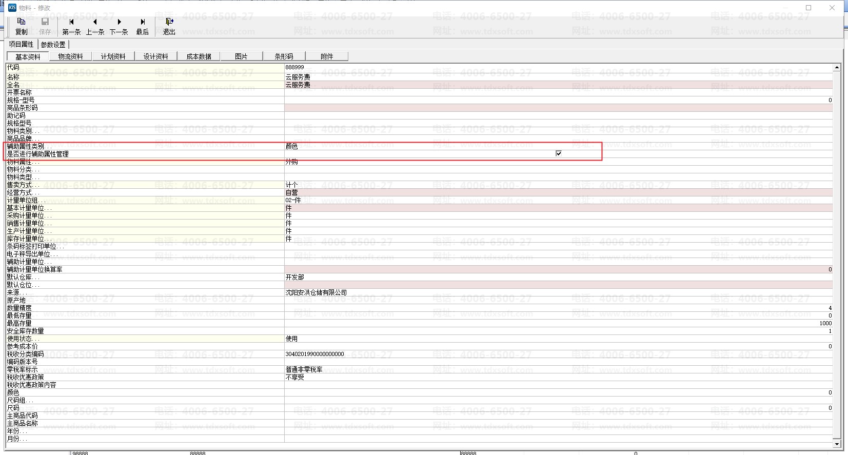 (2)在物料基础资料页勾选启用辅助属性管理后,选择物料辅助属性类别,进入采购订单录入界面,在辅助属性栏内按F7,可自定义新增物料的辅助属性。