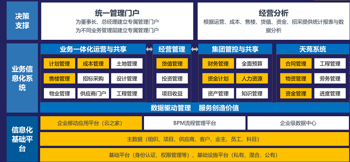 荣安地产作为宁波市房地产企业的龙头老大,具有传统房地产行业资金需求金额大、占用时间长、跨区域、多项目的分级管控等特点。房地产行业发展日趋成熟,如何快速打造企业的核心竞争力,以地产项目运作的成功基因快速复制从而达到规模扩张的目的,如何实现资源的有效整合并建立企业管控和运营的风险管理机制,如何打造一个为业务服务、管理服务的管理平台,有效防范风险,提升运作效率,支撑企业实现发展成为“千亿荣安”的目标,将是集团业务管控及数字化转型的关键。