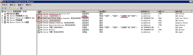 1、在SQL Server配置管理器或者服务里面,将不用的数据库实例停止运行并将启动类型改成禁用;