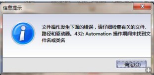 文件操作发生下面的错误,请仔细检查有关文件,路径和驱动器。432:Automation 操作期间未找到文件和类名。确定后,会提示DLL文件缺失。