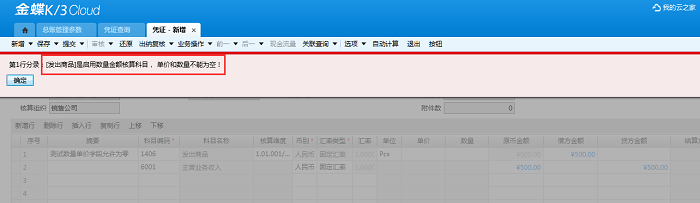 当未勾选该选项是时,系统则提示:启用数量金额核算科目,单价和数量不能为空!单击确定后凭证未保存,需要将单价和数量填写完整后才可保存,如下图:
