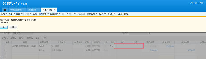 勾选该选项,启用数量金额辅助核算的会计科目在录入凭证时可以将数量、单价字段留空,系统仅提示“数量乘以单价不等于原币金额!是否继续?”点击是,凭证允许保存,如下图;