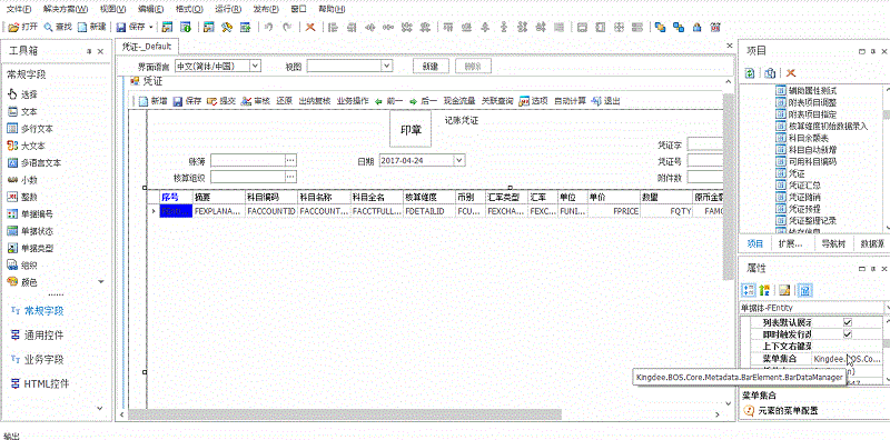 2.鼠标单击凭证单据体部分,在右下方属性中进入【菜单集合】;